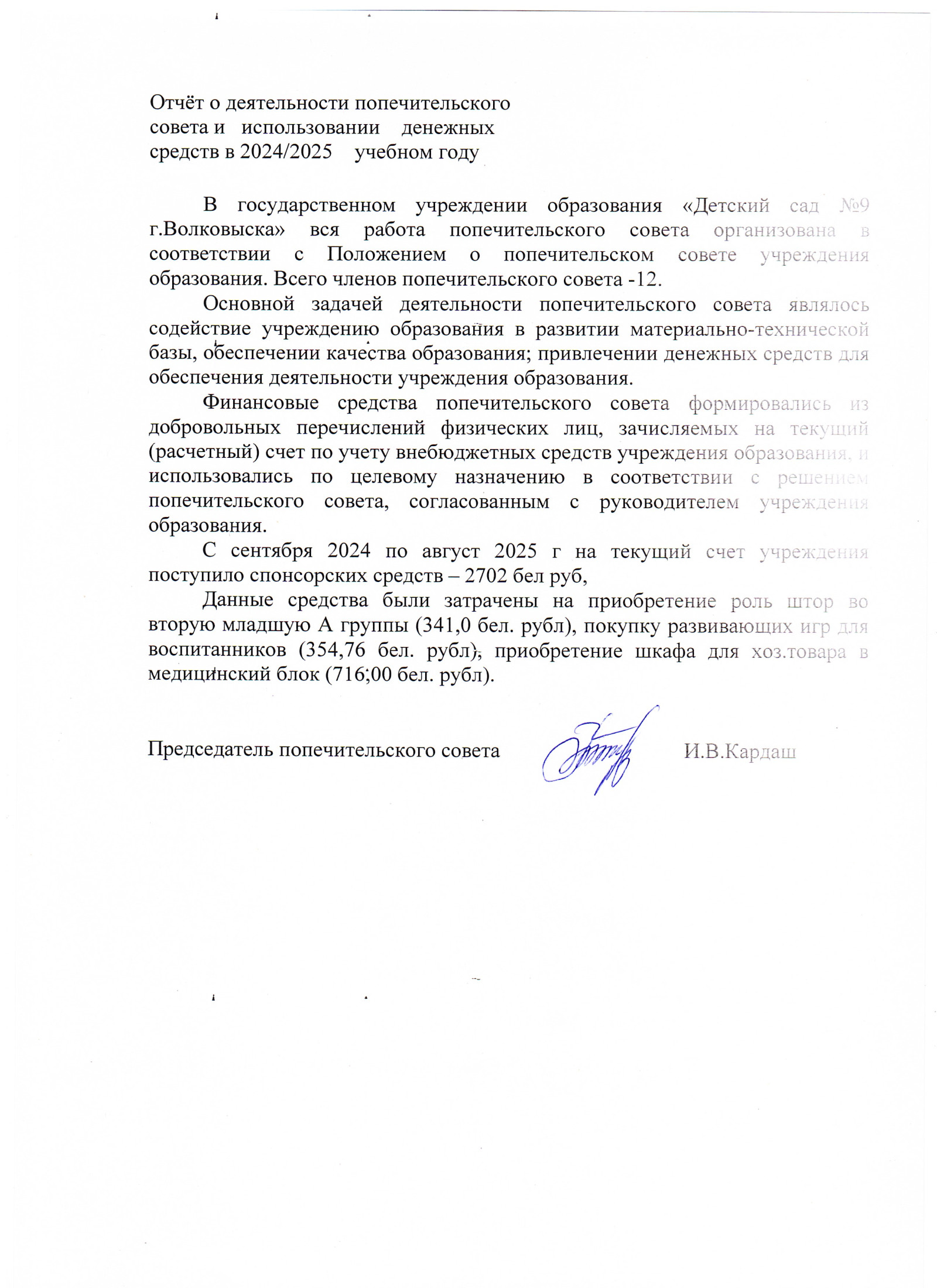 Председатель попечительского совета государственного учреждения образования "Детский сад № 9 г. Волковыска" - Кардаш Ирина Войтеховна (т. 801512 97948)